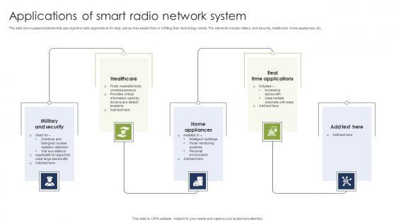 The slide showcases industries that use cognitive radio applications for daily use as they assist them in fulfilling their technology needs. The elements include military and security, healthcare, home appliances, etc. Showcasing this set of slides titled Applications Of Smart Radio Network System Summary Pdf. The topics addressed in these templates are Military Security, Healthcare, Home Appliances. All the content presented in this PPT design is completely editable. Download it and make adjustments in color, background, font etc. as per your unique business setting. The slide showcases industries that use cognitive radio applications for daily use as they assist them in fulfilling their technology needs. The elements include military and security, healthcare, home appliances, etc.