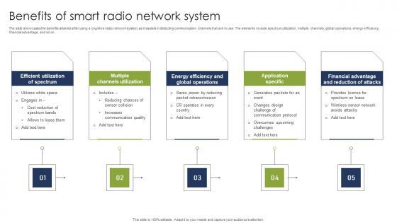 The slide showcases the benefits attained after using a cognitive radio network system, as it assists in detecting communication channels that are in use. The elements include spectrum utilization, multiple channels, global operations, energy efficiency, financial advantage, and so on. Showcasing this set of slides titled Benefits Of Smart Radio Network System Download Pdf. The topics addressed in these templates are Efficient Utilization Spectrum, Multiple Channels Utilization, Application Specific. All the content presented in this PPT design is completely editable. Download it and make adjustments in color, background, font etc. as per your unique business setting. The slide showcases the benefits attained after using a cognitive radio network system, as it assists in detecting communication channels that are in use. The elements include spectrum utilization, multiple channels, global operations, energy efficiency, financial advantage, and so on.