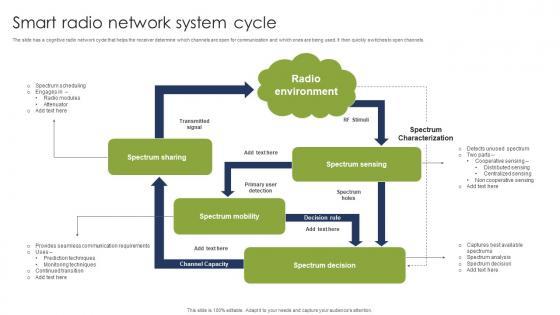 The slide has a cognitive radio network cycle that helps the receiver determine which channels are open for communication and which ones are being used. It then quickly switches to open channels. Pitch your topic with ease and precision using this Smart Radio Network System Cycle Demonstration Pdf. This layout presents information on Radio Environment, Spectrum Sharing, Spectrum Sensing. It is also available for immediate download and adjustment. So, changes can be made in the color, design, graphics or any other component to create a unique layout. The slide has a cognitive radio network cycle that helps the receiver determine which channels are open for communication and which ones are being used. It then quickly switches to open channels.