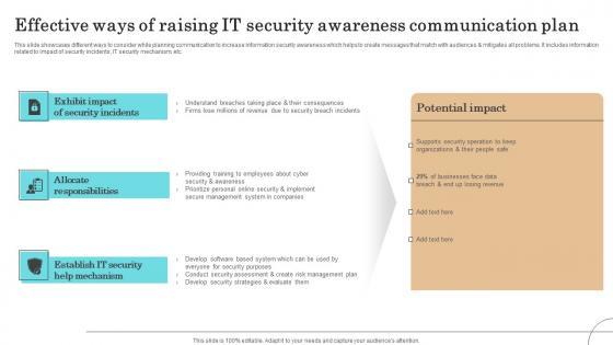 This slide showcases different ways to consider while planning communication to increase information security awareness which helps to create messages that match with audiences mitigates all problems. It includes information related to impact of security incidents, IT security mechanism, etc.Pitch your topic with ease and precision using this Effective Ways Of Raising It Security Awareness Communication Plan Demonstration Pdf This layout presents information on Secure Management, Prioritize Personal, Security Awareness It is also available for immediate download and adjustment. So, changes can be made in the color, design, graphics or any other component to create a unique layout. This slide showcases different ways to consider while planning communication to increase information security awareness which helps to create messages that match with audiences mitigates all problems. It includes information related to impact of security incidents, IT security mechanism, etc.