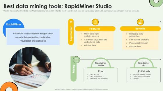 This slide showcases RapidMiner Studio, one of the best data mining tools available in the latter market. It provides details about data sources, data preparation, data exploration, process optimization, visual data science, etc. Want to ace your presentation in front of a live audience Our Best Data Mining Tools Rapidminer Studio Using Data Mining Tools To Optimize Processes AI SS V can help you do that by engaging all the users towards you. Slidegeeks experts have put their efforts and expertise into creating these impeccable powerpoint presentations so that you can communicate your ideas clearly. Moreover, all the templates are customizable, and easy-to-edit and downloadable. Use these for both personal and commercial use. This slide showcases RapidMiner Studio, one of the best data mining tools available in the latter market. It provides details about data sources, data preparation, data exploration, process optimization, visual data science, etc.