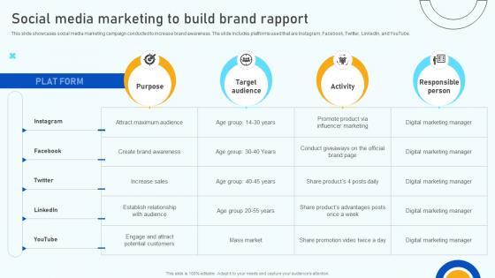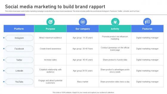This slide showcases social media marketing campaign conducted to increase brand awareness. The slide includes platforms used that are Instagram, Facebook, Twitter, LinkedIn, and YouTube. Get a simple yet stunning designed Digital Marketing Strategies Social Media Marketing To Build Brand Rapport SA SS V. It is the best one to establish the tone in your meetings. It is an excellent way to make your presentations highly effective. So, download this PPT today from Slidegeeks and see the positive impacts. Our easy-to-edit Digital Marketing Strategies Social Media Marketing To Build Brand Rapport SA SS V can be your go-to option for all upcoming conferences and meetings. So, what are you waiting for Grab this template today. This slide showcases social media marketing campaign conducted to increase brand awareness. The slide includes platforms used that are Instagram, Facebook, Twitter, LinkedIn, and YouTube.