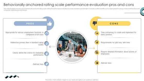 This slide illustrate pros and cons of behaviorally anchored rating scale method for performance evaluation to assess weakness and strength. It includes positive benefits such as appropriate for various employment functions and companies, addresses primary flaw etc. Create an editable Behaviorally Anchored Rating Scale Performance Evaluation Skill Enhancement Performance that communicates your idea and engages your audience. Whether you are presenting a business or an educational presentation, pre-designed presentation templates help save time. Behaviorally Anchored Rating Scale Performance Evaluation Skill Enhancement Performance is highly customizable and very easy to edit, covering many different styles from creative to business presentations. Slidegeeks has creative team members who have crafted amazing templates. So, go and get them without any delay. This slide illustrate pros and cons of behaviorally anchored rating scale method for performance evaluation to assess weakness and strength. It includes positive benefits such as appropriate for various employment functions and companies, addresses primary flaw etc.