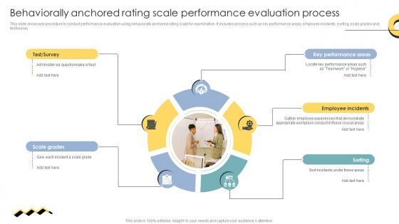 This slide showcase procedure to conduct performance evaluation using behaviorally anchored rating scale for examination. It includes process such as key performance areas, employee incidents, sorting, scale grades and test or survey. Crafting an eye-catching presentation has never been more straightforward. Let your presentation shine with this tasteful yet straightforward Skill Enhancement Performance Behaviorally Anchored Rating Scale Performance Evaluation Process template. It offers a minimalistic and classy look that is great for making a statement. The colors have been employed intelligently to add a bit of playfulness while still remaining professional. Construct the ideal Skill Enhancement Performance Behaviorally Anchored Rating Scale Performance Evaluation Process that effortlessly grabs the attention of your audience Begin now and be certain to wow your customers This slide showcase procedure to conduct performance evaluation using behaviorally anchored rating scale for examination. It includes process such as key performance areas, employee incidents, sorting, scale grades and test or survey.
