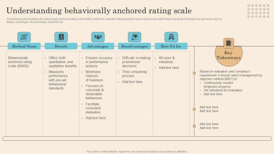The following slide illustrates the behaviorally anchored rating scale BARS method to evaluate individual performance based on pre determined standards. It includes key elements such as details, advantages, disadvantages, best fit for etc. Slidegeeks is one of the best resources for PowerPoint templates. You can download easily and regulate Understanding Behaviorally Anchored Rating Scale Executing Successful Staff Performance Microsoft Pdf for your personal presentations from our wonderful collection. A few clicks is all it takes to discover and get the most relevant and appropriate templates. Use our Templates to add a unique zing and appeal to your presentation and meetings. All the slides are easy to edit and you can use them even for advertisement purposes. The following slide illustrates the behaviorally anchored rating scale BARS method to evaluate individual performance based on pre determined standards. It includes key elements such as details, advantages, disadvantages, best fit for etc.