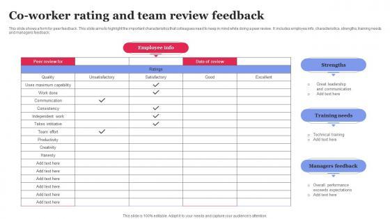 This slide shows a form for peer feedback. This slide aims to highlight the important characteristics that colleagues need to keep in mind while doing a peer review. It includes employee info, characteristics, strengths, training needs and managers feedback. Showcasing this set of slides titled Co Worker Rating And Team Review Feedback Slides Pdf The topics addressed in these templates are Communication, Independent Work, Productivity All the content presented in this PPT design is completely editable. Download it and make adjustments in color, background, font etc. as per your unique business setting. This slide shows a form for peer feedback. This slide aims to highlight the important characteristics that colleagues need to keep in mind while doing a peer review. It includes employee info, characteristics, strengths, training needs and managers feedback.
