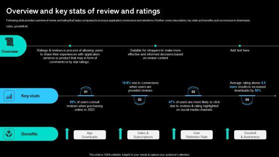Following slide provides overview of review and rating that helps companies to increase application conversions and retentions. It further covers description, key stats and benefits such as increase in downloads, sales, goodwill etc. This modern and well-arranged Overview And Key Stats Of Review And Ratings Online Customer Acquisition Information Pdf provides lots of creative possibilities. It is very simple to customize and edit with the Powerpoint Software. Just drag and drop your pictures into the shapes. All facets of this template can be edited with Powerpoint no extra software is necessary. Add your own material, put your images in the places assigned for them, adjust the colors, and then you can show your slides to the world, with an animated slide included. Following slide provides overview of review and rating that helps companies to increase application conversions and retentions. It further covers description, key stats and benefits such as increase in downloads, sales, goodwill etc.