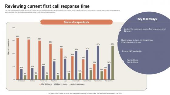 The following slide depicts the key results of how many customers receive first response for their queries within or after twenty four hours across multiple channel. It includes elements such as online chat, chatbots, applications, social media, instant responses etc. The best PPT templates are a great way to save time, energy, and resources. Slidegeeks have 100 percent editable powerpoint slides making them incredibly versatile. With these quality presentation templates, you can create a captivating and memorable presentation by combining visually appealing slides and effectively communicating your message. Download Reviewing Current First Call Response Time Boosting Customer Retention Rate With Live Chat from Slidegeeks and deliver a wonderful presentation. The following slide depicts the key results of how many customers receive first response for their queries within or after twenty four hours across multiple channel. It includes elements such as online chat, chatbots, applications, social media, instant responses etc.