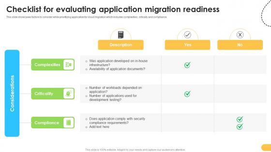 This slide showcases factors to consider while prioritizing application for cloud migration which includes complexities, critically and compliance. Get a simple yet stunning designed Effective Data Migration Checklist For Evaluating Application Migration Readiness. It is the best one to establish the tone in your meetings. It is an excellent way to make your presentations highly effective. So, download this PPT today from Slidegeeks and see the positive impacts. Our easy-to-edit Effective Data Migration Checklist For Evaluating Application Migration Readiness can be your go-to option for all upcoming conferences and meetings. So, what are you waiting for Grab this template today. This slide showcases factors to consider while prioritizing application for cloud migration which includes complexities, critically and compliance.