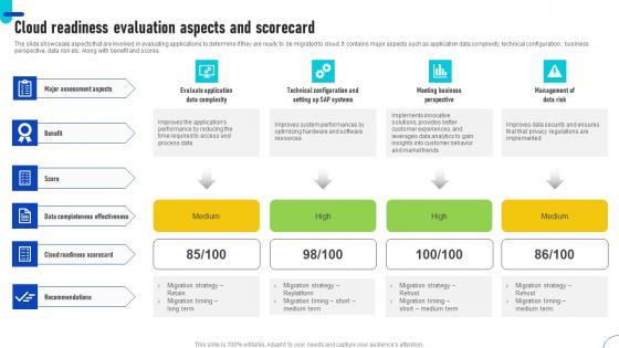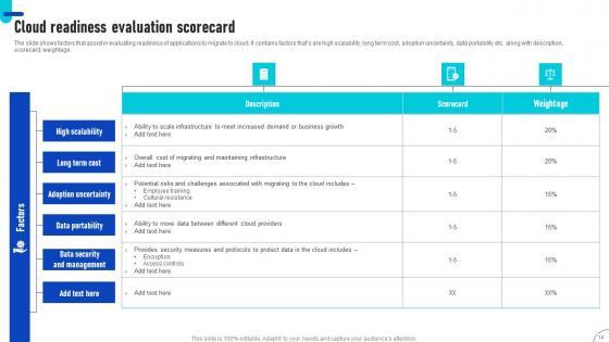 The slide shows factors that assist in evaluating readiness of applications to migrate to cloud. It contains factors thats are high scalability, long term cost, adoption uncertainty, data portability etc. along with description, scorecard, weightage. Pitch your topic with ease and precision using this Cloud Readiness Evaluation Scorecard Ppt Gallery Tips Pdf. This layout presents information on Long Term Cost, Adoption Uncertainty, Data Portability. It is also available for immediate download and adjustment. So, changes can be made in the color, design, graphics or any other component to create a unique layout. The slide shows factors that assist in evaluating readiness of applications to migrate to cloud. It contains factors thats are high scalability, long term cost, adoption uncertainty, data portability etc. along with description, scorecard, weightage.