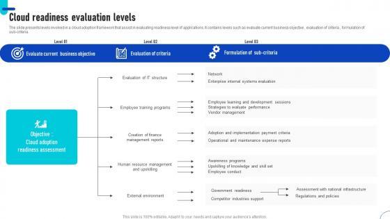 The slide presents levels involved in a cloud adoption framework that assist in evaluating readiness level of applications. It contains levels such as evaluate current business objective, evaluation of criteria, formulation of sub-criteria. Pitch your topic with ease and precision using this Cloud Readiness Evaluation Levels Ppt Styles Portfolio Pdf. This layout presents information on Employee Training Programs, Human Resource, Management And Upskilling. It is also available for immediate download and adjustment. So, changes can be made in the color, design, graphics or any other component to create a unique layout. The slide presents levels involved in a cloud adoption framework that assist in evaluating readiness level of applications. It contains levels such as evaluate current business objective, evaluation of criteria, formulation of sub-criteria.