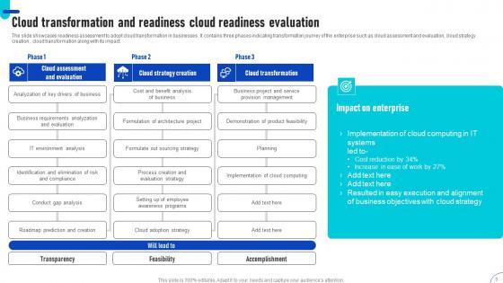 The slide showcases readiness assessment to adopt cloud transformation in businesses. It contains three phases indicating transformation journey of the enterprise such as cloud assessment and evaluation, cloud strategy creation, cloud transformation along with its impact. Showcasing this set of slides titled Cloud Transformation And Readiness Cloud Readiness Evaluation Ppt Inspiration Example Topics Pdf. The topics addressed in these templates are Cloud Assessment, Cloud Strategy Creation, Cloud Transformation. All the content presented in this PPT design is completely editable. Download it and make adjustments in color, background, font etc. as per your unique business setting. The slide showcases readiness assessment to adopt cloud transformation in businesses. It contains three phases indicating transformation journey of the enterprise such as cloud assessment and evaluation, cloud strategy creation, cloud transformation along with its impact.