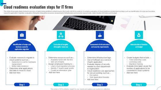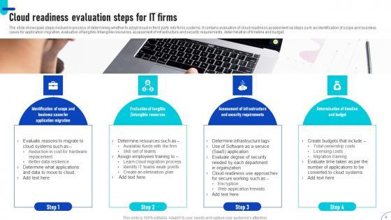 The slide showcases steps involved in process of determining whether to adopt cloud or third party into firms systems. It contains evaluation of cloud readiness assessment via steps such as identification of scope and business cases for application migration, evaluation of tangible intangible resources, assessment of infrastructure and security requirements, determination of timeline and budget. Pitch your topic with ease and precision using this Cloud Readiness Evaluation Steps For IT Firms Ppt Outline Files Pdf. This layout presents information on Determine Resources, Assign Employees Training, Determine Applications. It is also available for immediate download and adjustment. So, changes can be made in the color, design, graphics or any other component to create a unique layout. The slide showcases steps involved in process of determining whether to adopt cloud or third party into firms systems. It contains evaluation of cloud readiness assessment via steps such as identification of scope and business cases for application migration, evaluation of tangible intangible resources, assessment of infrastructure and security requirements, determination of timeline and budget.