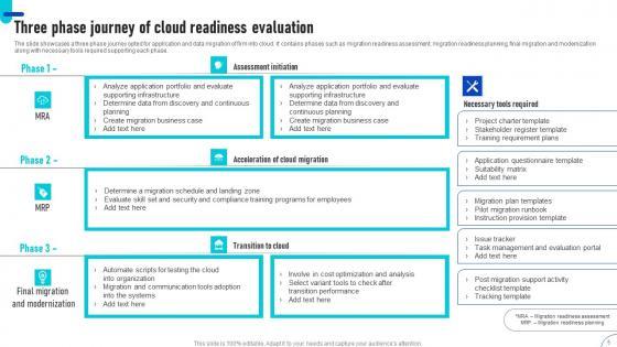 The slide showcases a three phase journey opted for application and data migration of firm into cloud. It contains phases such as migration readiness assessment, migration readiness planning, final migration and modernization along with necessary tools required supporting each phase. Pitch your topic with ease and precision using this Three Phase Journey Of Cloud Readiness Evaluation Ppt Model Design Ideas Pdf. This layout presents information on Assessment Initiation, Transition To Cloud, Acceleration Cloud Migration. It is also available for immediate download and adjustment. So, changes can be made in the color, design, graphics or any other component to create a unique layout. The slide showcases a three phase journey opted for application and data migration of firm into cloud. It contains phases such as migration readiness assessment, migration readiness planning, final migration and modernization along with necessary tools required supporting each phase.