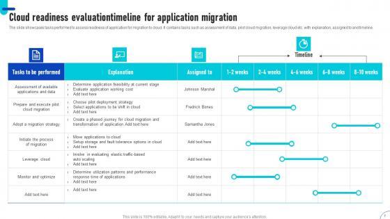 The slide showcases tasks performed to assess readiness of application for migration to cloud. It contains tasks such as assessment of data, pilot cloud migration, leverage cloud etc. with explanation, assigned to and timeline. Pitch your topic with ease and precision using this Cloud Readiness Evaluationtimeline For Application Migration Ppt Layouts Outline Pdf. This layout presents information on Pilot Cloud Migration, Leverage Cloud, Business. It is also available for immediate download and adjustment. So, changes can be made in the color, design, graphics or any other component to create a unique layout. The slide showcases tasks performed to assess readiness of application for migration to cloud. It contains tasks such as assessment of data, pilot cloud migration, leverage cloud etc. with explanation, assigned to and timeline.