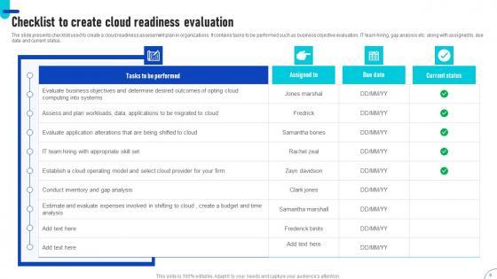 The slide presents checklist used to create a cloud readiness assessment plan in organizations. It contains tasks to be performed such as business objective evaluation, IT team hiring, gap analysis etc. along with assigned to, due date and current status. Showcasing this set of slides titled Checklist To Create Cloud Readiness Evaluation Ppt Show Graphics Design Pdf. The topics addressed in these templates are Business Objective Evaluation, IT Team Hiring, Gap Analysis. All the content presented in this PPT design is completely editable. Download it and make adjustments in color, background, font etc. as per your unique business setting. The slide presents checklist used to create a cloud readiness assessment plan in organizations. It contains tasks to be performed such as business objective evaluation, IT team hiring, gap analysis etc. along with assigned to, due date and current status.