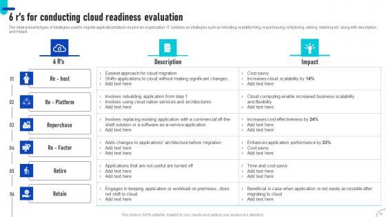 The slide presents types of strategies used to migrate application data to cloud in an organization. IT contains six strategies such as rehosting, re platforming, re purchasing, re factoring, retiring, retaining etc. along with description and impact. Showcasing this set of slides titled 6 Rs For Conducting Cloud Readiness Evaluation Ppt Icon Guide Pdf. The topics addressed in these templates are Re Platforming, Re Purchasing, Re Factoring. All the content presented in this PPT design is completely editable. Download it and make adjustments in color, background, font etc. as per your unique business setting. The slide presents types of strategies used to migrate application data to cloud in an organization. IT contains six strategies such as rehosting, re platforming, re purchasing, re factoring, retiring, retaining etc. along with description and impact.