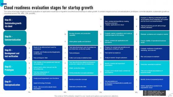 The slide showcases stages involved in evaluation of application readiness to migrate to cloud that assist startups to attain growth. It contains stages such as conceptualization, prototypes, commercialization, sustainable growth via cloud that assess TRL, MRL, CRL and BRL. Showcasing this set of slides titled Cloud Readiness Evaluation Stages For Startup Growth Ppt Pictures Graphics Pdf. The topics addressed in these templates are Conceptualization, Prototypes, Commercialization. All the content presented in this PPT design is completely editable. Download it and make adjustments in color, background, font etc. as per your unique business setting. The slide showcases stages involved in evaluation of application readiness to migrate to cloud that assist startups to attain growth. It contains stages such as conceptualization, prototypes, commercialization, sustainable growth via cloud that assess TRL, MRL, CRL and BRL.