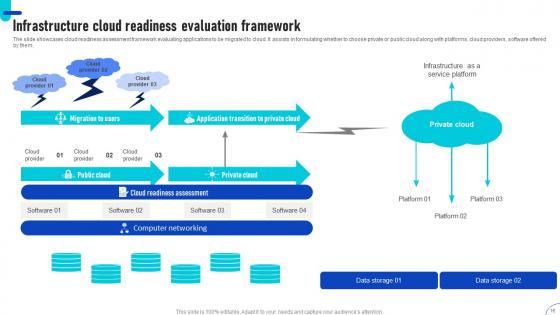 The slide showcases cloud readiness assessment framework evaluating applications to be migrated to cloud. It assists in formulating whether to choose private or public cloud along with platforms, cloud providers, software offered by them. Showcasing this set of slides titled Infrastructure Cloud Readiness Evaluation Framework Ppt File Skills Pdf. The topics addressed in these templates are Cloud Provider, Public Cloud, Private Cloud. All the content presented in this PPT design is completely editable. Download it and make adjustments in color, background, font etc. as per your unique business setting. The slide showcases cloud readiness assessment framework evaluating applications to be migrated to cloud. It assists in formulating whether to choose private or public cloud along with platforms, cloud providers, software offered by them.