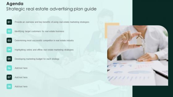 Find a pre-designed and impeccable Agenda Strategic Real Estate Advertising Plan Guide Infographics Pdf The templates can ace your presentation without additional effort. You can download these easy-to-edit presentation templates to make your presentation stand out from others. So, what are you waiting for Download the template from Slidegeeks today and give a unique touch to your presentation. Our Agenda Strategic Real Estate Advertising Plan Guide Infographics Pdf are topically designed to provide an attractive backdrop to any subject. Use them to look like a presentation pro.