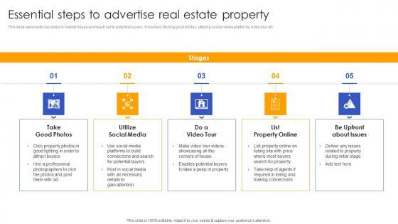 This slide represents key steps to market house and reach out to potential buyers. It involves clicking good photos, utilizing social media platforms, video tour etc. Are you in need of a template that can accommodate all of your creative concepts This one is crafted professionally and can be altered to fit any style. Use it with Google Slides or PowerPoint. Include striking photographs, symbols, depictions, and other visuals. Fill, move around, or remove text boxes as desired. Test out color palettes and font mixtures. Edit and save your work, or work with colleagues. Download Essential Steps To Advertise Real Estate Deploying Effective Property Flipping Strategies Demonstration Pdf and observe how to make your presentation outstanding. Give an impeccable presentation to your group and make your presentation unforgettable. This slide represents key steps to market house and reach out to potential buyers. It involves clicking good photos, utilizing social media platforms, video tour etc.