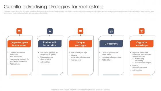 This slide covers strategies of guerilla advertising for real estate industries. The purpose of this slide is provide ideas for promoting vacant property and enhancing customer engagement. These techniques are organizing open house event, partner with local artist, using unique yard signs etc. Showcasing this set of slides titled Guerilla Advertising Strategies For Real Estate Slides Pdf. The topics addressed in these templates are Organize Open, Partner With Local Artists, Unique Yard Signs. All the content presented in this PPT design is completely editable. Download it and make adjustments in color, background, font etc. as per your unique business setting. This slide covers strategies of guerilla advertising for real estate industries. The purpose of this slide is provide ideas for promoting vacant property and enhancing customer engagement. These techniques are organizing open house event, partner with local artist, using unique yard signs etc.