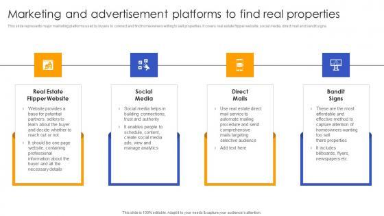 This slide represents major marketing platforms used by buyers to connect and find homeowners willing to sell properties. It covers real estate flipper website, social media, direct mail and bandit signs. Slidegeeks is one of the best resources for PowerPoint templates. You can download easily and regulate Fix And Flip Method For Renovating Real Estate Marketing And Advertisement Platforms Find Structure PDF for your personal presentations from our wonderful collection. A few clicks is all it takes to discover and get the most relevant and appropriate templates. Use our Templates to add a unique zing and appeal to your presentation and meetings. All the slides are easy to edit and you can use them even for advertisement purposes.