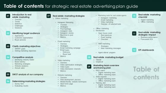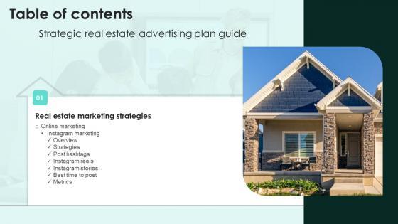 The best PPT templates are a great way to save time, energy, and resources. Slidegeeks have 100 percent editable powerpoint slides making them incredibly versatile. With these quality presentation templates, you can create a captivating and memorable presentation by combining visually appealing slides and effectively communicating your message. Download Table Of Contents For Strategic Real Estate Advertising Plan Guide Download Pdf from Slidegeeks and deliver a wonderful presentation. Our Table Of Contents For Strategic Real Estate Advertising Plan Guide Download Pdf are topically designed to provide an attractive backdrop to any subject. Use them to look like a presentation pro.