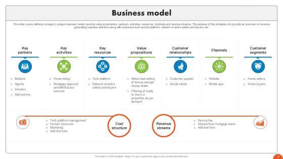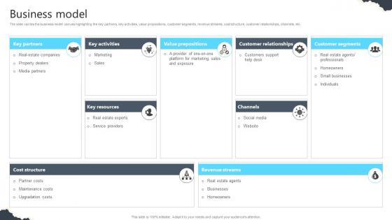 The slide carries the business model canvas highlighting the key partners, key activities, value propositions, customer segments, revenue streams, cost structure, customer relationships, channels, etc. Boost your pitch with our creative Business Model Real Estate Platform Investor Funding Elevator Pitch Deck. Deliver an awe-inspiring pitch that will mesmerize everyone. Using these presentation templates you will surely catch everyones attention. You can browse the ppts collection on our website. We have researchers who are experts at creating the right content for the templates. So you do not have to invest time in any additional work. Just grab the template now and use them. The slide carries the business model canvas highlighting the key partners, key activities, value propositions, customer segments, revenue streams, cost structure, customer relationships, channels, etc.