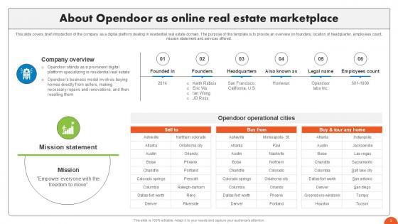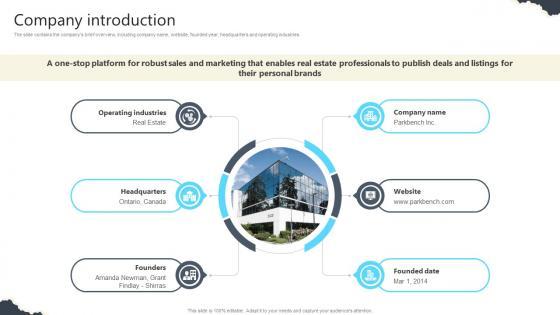 The slide contains the companys brief overview, including company name, website, founded year, headquarters and operating industries. Slidegeeks is one of the best resources for PowerPoint templates. You can download easily and regulate Company Introduction Real Estate Platform Investor Funding Elevator Pitch Deck for your personal presentations from our wonderful collection. A few clicks is all it takes to discover and get the most relevant and appropriate templates. Use our Templates to add a unique zing and appeal to your presentation and meetings. All the slides are easy to edit and you can use them even for advertisement purposes. The slide contains the companys brief overview, including company name, website, founded year, headquarters and operating industries.