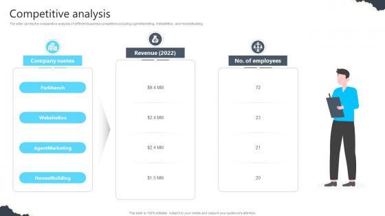 The slide carries the comparative analysis of different business competitors including AgentMarketing, WebsiteBox, and HonestBuilding. Want to ace your presentation in front of a live audience Our Competitive Analysis Real Estate Platform Investor Funding Elevator Pitch Deck can help you do that by engaging all the users towards you. Slidegeeks experts have put their efforts and expertise into creating these impeccable powerpoint presentations so that you can communicate your ideas clearly. Moreover, all the templates are customizable, and easy-to-edit and downloadable. Use these for both personal and commercial use. The slide carries the comparative analysis of different business competitors including AgentMarketing, WebsiteBox, and HonestBuilding.