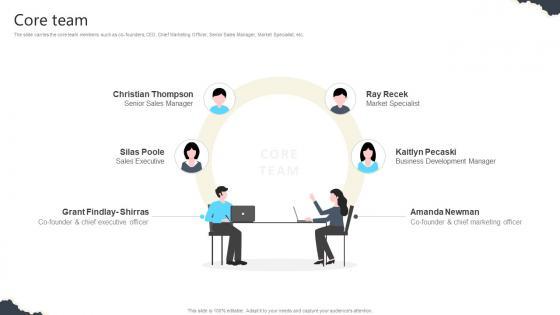 The slide carries the core team members such as co-founders, CEO, Chief Marketing Officer, Senior Sales Manager, Market Specialist, etc. Do you have to make sure that everyone on your team knows about any specific topic I yes, then you should give Core Team Real Estate Platform Investor Funding Elevator Pitch Deck a try. Our experts have put a lot of knowledge and effort into creating this impeccable Core Team Real Estate Platform Investor Funding Elevator Pitch Deck. You can use this template for your upcoming presentations, as the slides are perfect to represent even the tiniest detail. You can download these templates from the Slidegeeks website and these are easy to edit. So grab these today The slide carries the core team members such as co-founders, CEO, Chief Marketing Officer, Senior Sales Manager, Market Specialist, etc.
