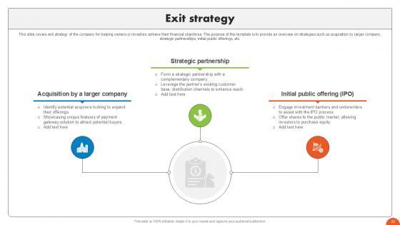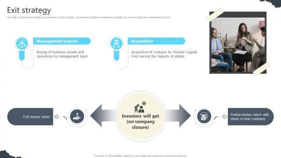 The slide carries the exit strategy of a company in case of failure. Various exit strategies included are acquisition by venture capital and management buyout. From laying roadmaps to briefing everything in detail, our templates are perfect for you. You can set the stage with your presentation slides. All you have to do is download these easy-to-edit and customizable templates. Exit Strategy Real Estate Platform Investor Funding Elevator Pitch Deck will help you deliver an outstanding performance that everyone would remember and praise you for. Do download this presentation today. The slide carries the exit strategy of a company in case of failure. Various exit strategies included are acquisition by venture capital and management buyout.