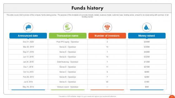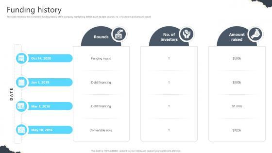 The slide mentions the investment funding history of the company highlighting details such as date, rounds, no. of investors and amount raised. Slidegeeks is here to make your presentations a breeze with Funding History Real Estate Platform Investor Funding Elevator Pitch Deck With our easy-to-use and customizable templates, you can focus on delivering your ideas rather than worrying about formatting. With a variety of designs to choose from, you are sure to find one that suits your needs. And with animations and unique photos, illustrations, and fonts, you can make your presentation pop. So whether you are giving a sales pitch or presenting to the board, make sure to check out Slidegeeks first The slide mentions the investment funding history of the company highlighting details such as date, rounds, no. of investors and amount raised.