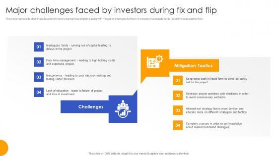 This slide represents challenges faced by investors during house flipping along with mitigation strategies for them. It includes inadequate funds, poor time management etc. The Fix And Flip Method For Renovating Real Estate Major Challenges Faced By Investors During Introduction PDF is a compilation of the most recent design trends as a series of slides. It is suitable for any subject or industry presentation, containing attractive visuals and photo spots for businesses to clearly express their messages. This template contains a variety of slides for the user to input data, such as structures to contrast two elements, bullet points, and slides for written information. Slidegeeks is prepared to create an impression.