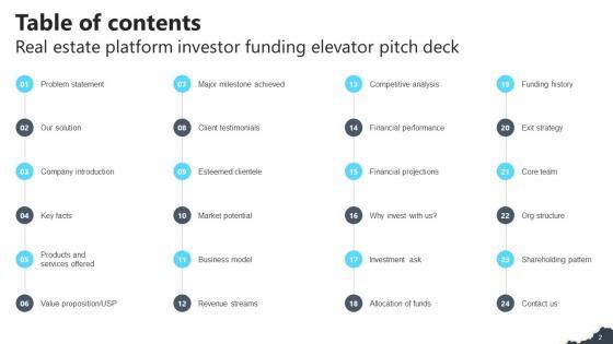 Welcome to our selection of the Table Of Contents Real Estate Platform Investor Funding Elevator Pitch Deck. These are designed to help you showcase your creativity and bring your sphere to life. Planning and Innovation are essential for any business that is just starting out. This collection contains the designs that you need for your everyday presentations. All of our PowerPoints are 100Percent editable, so you can customize them to suit your needs. This multi-purpose template can be used in various situations. Grab these presentation templates today. Our Table Of Contents Real Estate Platform Investor Funding Elevator Pitch Deck are topically designed to provide an attractive backdrop to any subject. Use them to look like a presentation pro.