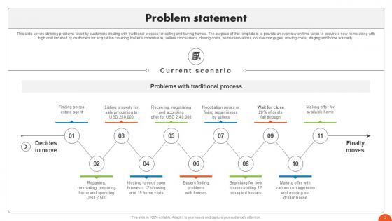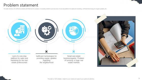 The slide mentions the different problems identified by the company. It includes problems such as a lack of one-stop platform for sales and marketing, inefficient technology for regular updates, etc. Make sure to capture your audiences attention in your business displays with our gratis customizable Problem Statement Real Estate Platform Investor Funding Elevator Pitch Deck. These are great for business strategies, office conferences, capital raising or task suggestions. If you desire to acquire more customers for your tech business and ensure they stay satisfied, create your own sales presentation with these plain slides. The slide mentions the different problems identified by the company. It includes problems such as a lack of one-stop platform for sales and marketing, inefficient technology for regular updates, etc.