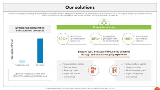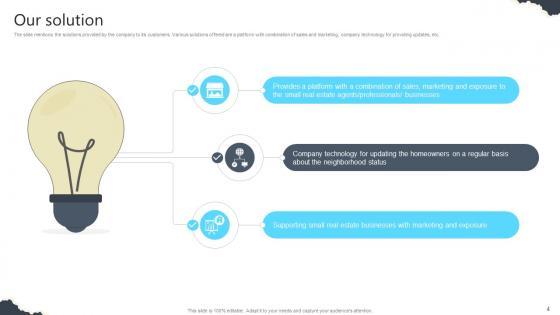 The slide mentions the solutions provided by the company to its customers. Various solutions offered are a platform with combination of sales and marketing, company technology for providing updates, etc. Crafting an eye-catching presentation has never been more straightforward. Let your presentation shine with this tasteful yet straightforward Our Solution Real Estate Platform Investor Funding Elevator Pitch Deck template. It offers a minimalistic and classy look that is great for making a statement. The colors have been employed intelligently to add a bit of playfulness while still remaining professional. Construct the ideal Our Solution Real Estate Platform Investor Funding Elevator Pitch Deck that effortlessly grabs the attention of your audience Begin now and be certain to wow your customers The slide mentions the solutions provided by the company to its customers. Various solutions offered are a platform with combination of sales and marketing, company technology for providing updates, etc.