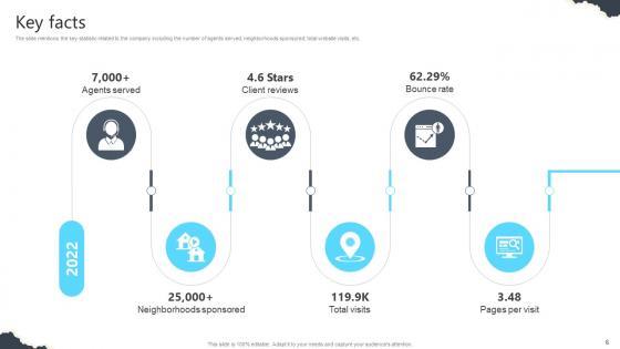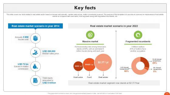 The slide mentions the key statistic related to the company including the number of agents served, neighborhoods sponsored, total website visits, etc. Find highly impressive Key Facts Real Estate Platform Investor Funding Elevator Pitch Deck on Slidegeeks to deliver a meaningful presentation. You can save an ample amount of time using these presentation templates. No need to worry to prepare everything from scratch because Slidegeeks experts have already done a huge research and work for you. You need to download Key Facts Real Estate Platform Investor Funding Elevator Pitch Deck for your upcoming presentation. All the presentation templates are 100 percent editable and you can change the color and personalize the content accordingly. Download now The slide mentions the key statistic related to the company including the number of agents served, neighborhoods sponsored, total website visits, etc.