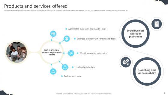 The slide carries the various products and services provided by the company to its customers. Various services offered are a platform with aggregated local news, business directory with reviews, etc. Formulating a presentation can take up a lot of effort and time, so the content and message should always be the primary focus. The visuals of the PowerPoint can enhance the presenters message, so our Products And Services Offered Real Estate Platform Investor Funding Elevator Pitch Deck was created to help save time. Instead of worrying about the design, the presenter can concentrate on the message while our designers work on creating the ideal templates for whatever situation is needed. Slidegeeks has experts for everything from amazing designs to valuable content, we have put everything into Products And Services Offered Real Estate Platform Investor Funding Elevator Pitch Deck. The slide carries the various products and services provided by the company to its customers. Various services offered are a platform with aggregated local news, business directory with reviews, etc.