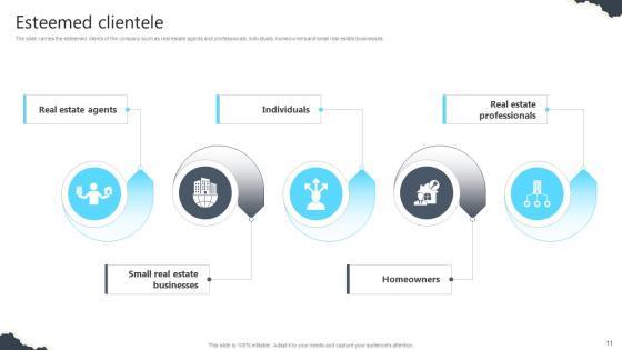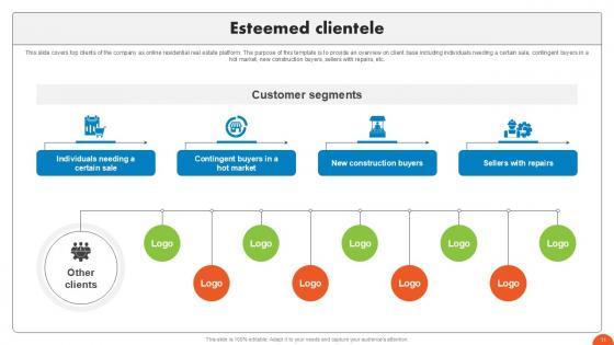 The slide carries the esteemed clients of the company such as real estate agents and professionals, individuals, homeowners and small real estate businesses. Get a simple yet stunning designed Esteemed Clientele Real Estate Platform Investor Funding Elevator Pitch Deck. It is the best one to establish the tone in your meetings. It is an excellent way to make your presentations highly effective. So, download this PPT today from Slidegeeks and see the positive impacts. Our easy-to-edit Esteemed Clientele Real Estate Platform Investor Funding Elevator Pitch Deck can be your go-to option for all upcoming conferences and meetings. So, what are you waiting for Grab this template today. The slide carries the esteemed clients of the company such as real estate agents and professionals, individuals, homeowners and small real estate businesses.