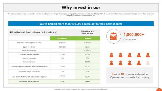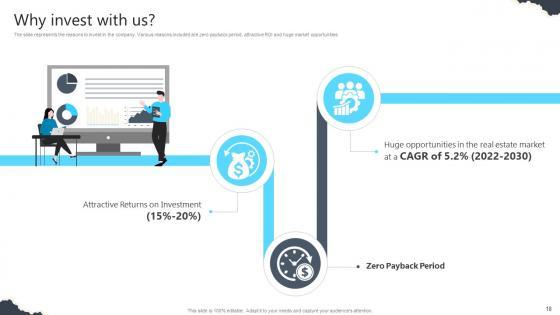 The slide represents the reasons to invest in the company. Various reasons included are zero payback period, attractive ROI and huge market opportunities. The best PPT templates are a great way to save time, energy, and resources. Slidegeeks have 100 percent editable powerpoint slides making them incredibly versatile. With these quality presentation templates, you can create a captivating and memorable presentation by combining visually appealing slides and effectively communicating your message. Download Why Invest With Us Real Estate Platform Investor Funding Elevator Pitch Deck from Slidegeeks and deliver a wonderful presentation. The slide represents the reasons to invest in the company. Various reasons included are zero payback period, attractive ROI and huge market opportunities.