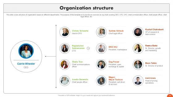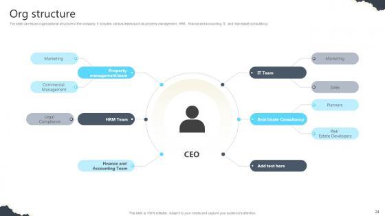 The slide carries an organizational structure of the company. It includes various teams such as property management, HRM, finance and accounting, IT, and real estate consultancy. Are you in need of a template that can accommodate all of your creative concepts This one is crafted professionally and can be altered to fit any style. Use it with Google Slides or PowerPoint. Include striking photographs, symbols, depictions, and other visuals. Fill, move around, or remove text boxes as desired. Test out color palettes and font mixtures. Edit and save your work, or work with colleagues. Download Org Structure Real Estate Platform Investor Funding Elevator Pitch Deck and observe how to make your presentation outstanding. Give an impeccable presentation to your group and make your presentation unforgettable. The slide carries an organizational structure of the company. It includes various teams such as property management, HRM, finance and accounting, IT, and real estate consultancy.