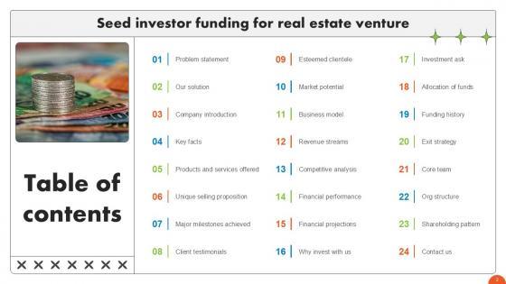This thirty five-slide Seed Investor Funding For Real Estate Venture Ppt Example is your content ready tool to impress the stakeholders with your business planning and its manner of execution. Showcase your ideas and how you plan to make them real in detail with this PPT Template Bundle. The slides have the conceptual bandwidth to present the crucial aspects of your plan, such as funding, marketing, resource allocation, timeline, roadmap, and more. When you present your plans with this PPT Layout, the stakeholders are sure to come on board because you will be able to present a succinct, thought-out, winning project. Download this Complete Deck now to take control into your hands. The 100 percent customizable offer is just too good to be resisted. Our Seed Investor Funding For Real Estate Venture Ppt Example are topically designed to provide an attractive backdrop to any subject. Use them to look like a presentation pro.