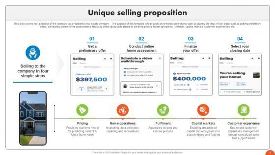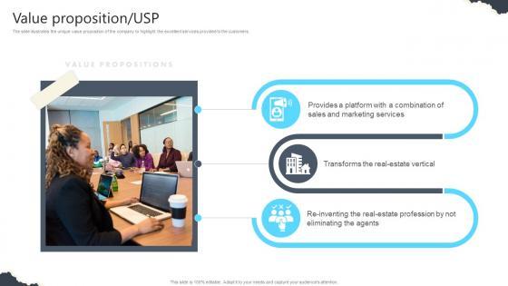 The slide illustrates the unique value proposition of the company to highlight the excellent services provided to the customers. Explore a selection of the finest Value Proposition Usp Real Estate Platform Investor Funding Elevator Pitch Deck here. With a plethora of professionally designed and pre-made slide templates, you can quickly and easily find the right one for your upcoming presentation. You can use our Value Proposition Usp Real Estate Platform Investor Funding Elevator Pitch Deck to effectively convey your message to a wider audience. Slidegeeks has done a lot of research before preparing these presentation templates. The content can be personalized and the slides are highly editable. Grab templates today from Slidegeeks. The slide illustrates the unique value proposition of the company to highlight the excellent services provided to the customers.