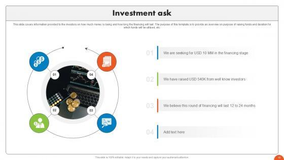 The slide highlights the total amount required for achieving the planned objectives for business growth and development. Whether you have daily or monthly meetings, a brilliant presentation is necessary. Investment Ask Real Estate Platform Investor Funding Elevator Pitch Deck can be your best option for delivering a presentation. Represent everything in detail using Investment Ask Real Estate Platform Investor Funding Elevator Pitch Deck and make yourself stand out in meetings. The template is versatile and follows a structure that will cater to your requirements. All the templates prepared by Slidegeeks are easy to download and edit. Our research experts have taken care of the corporate themes as well. So, give it a try and see the results. The slide highlights the total amount required for achieving the planned objectives for business growth and development.
