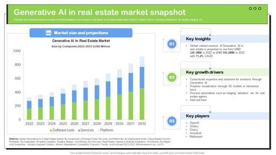 This slide showcases sectoral overview of artificial intelligence technology in real estate. It provides details about OpenAI, Gridics, Cherry, Autodesk, Matterport, 3D models, staging, etc. Explore a selection of the finest Transforming Real Estate Generative AI In Real Estate Market Snapshot ChatGPT SS V here. With a plethora of professionally designed and pre-made slide templates, you can quickly and easily find the right one for your upcoming presentation. You can use our Transforming Real Estate Generative AI In Real Estate Market Snapshot ChatGPT SS V to effectively convey your message to a wider audience. Slidegeeks has done a lot of research before preparing these presentation templates. The content can be personalized and the slides are highly editable. Grab templates today from Slidegeeks. This slide showcases sectoral overview of artificial intelligence technology in real estate. It provides details about OpenAI, Gridics, Cherry, Autodesk, Matterport, 3D models, staging, etc.