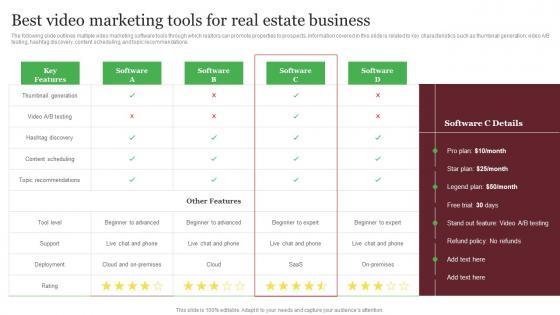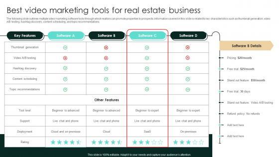 The following slide outlines multiple video marketing software tools through which realtors can promote properties to prospects. Information covered in this slide is related to key characteristics such as thumbnail generation, video AB testing, hashtag discovery, content scheduling, and topic recommendations. Do you have to make sure that everyone on your team knows about any specific topic I yes, then you should give Best Video Marketing Tools For Real Estate Business Out Of The Box Real Diagrams Pdf a try. Our experts have put a lot of knowledge and effort into creating this impeccable Key Features, Refund Policy You can use this template for your upcoming presentations, as the slides are perfect to represent even the tiniest detail. You can download these templates from the Slidegeeks website and these are easy to edit. So grab these today The following slide outlines multiple video marketing software tools through which realtors can promote properties to prospects. Information covered in this slide is related to key characteristics such as thumbnail generation, video AB testing, hashtag discovery, content scheduling, and topic recommendations.