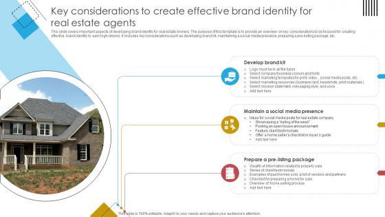 This slide covers important aspects of developing brand identity for real estate brokers. The purpose of this template is to provide an overview on key considerations to be focused for creating effective brand identity to earn high returns. It includes key considerations such as developing brand kit, maintaining a social media presence, preparing a pre-listing package, etc. Do you have to make sure that everyone on your team knows about any specific topic I yes, then you should give Blueprint For Effective Real Key Considerations To Create Effective Brand Identity Strategy SS V a try. Our experts have put a lot of knowledge and effort into creating this impeccable Blueprint For Effective Real Key Considerations To Create Effective Brand Identity Strategy SS V. You can use this template for your upcoming presentations, as the slides are perfect to represent even the tiniest detail. You can download these templates from the Slidegeeks website and these are easy to edit. So grab these today This slide covers important aspects of developing brand identity for real estate brokers. The purpose of this template is to provide an overview on key considerations to be focused for creating effective brand identity to earn high returns. It includes key considerations such as developing brand kit, maintaining a social media presence, preparing a pre-listing package, etc.