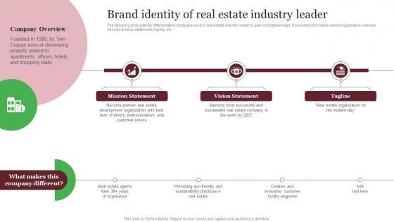 The following slide outlines differentiation strategies used by real estate industry leader to gain competitive edge. It provides information about organization overview, mission and vision statement, tagline, etc. Want to ace your presentation in front of a live audience Our Brand Identity Of Real Estate Industry Leader Guidelines PDF can help you do that by engaging all the users towards you.. Slidegeeks experts have put their efforts and expertise into creating these impeccable powerpoint presentations so that you can communicate your ideas clearly. Moreover, all the templates are customizable, and easy-to-edit and downloadable. Use these for both personal and commercial use.